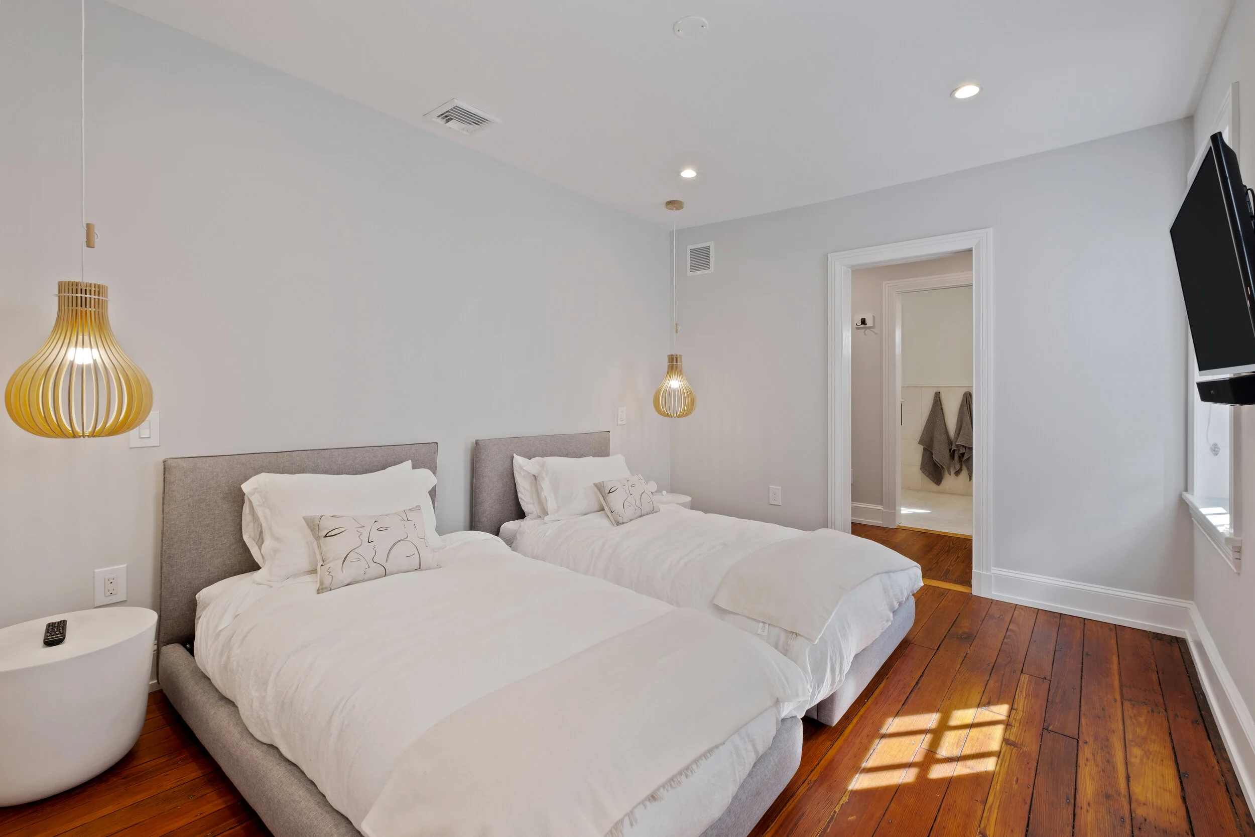 The second floor features 2 spacious bedrooms both with en-suite stone bathrooms with heated floors, custom vanities, seamless glass shower and California Closets outfitted walk in closets. An amazing bonus on this level--a huge laundry closet with utility sink, side by side front loading washer and dryer, plus ample storage. The top floor is the Owner's Suite and it opens into an impressive addition, the stairwell is naturally lit through the new electronic skylight, welcomes you into the spacious family room with high ceilings, a wall of windows and patio doors that lead to the roof deck to enjoy the City views. To the left, continue to the en-suite main bedroom with high ceilings, oversized windows, customized walk-in closet, beautiful Carrara marble bathroom with freestanding soaking tub, heated floors, glass enclosed shower and double basin sink vanity. Additional amenities include: finished basement, spray foam insulation, 200 amp new electrical panel, new curb trap under sidewalk, dual zoned HVAC, (4) security cameras w/ video recorder, The Shade Store blinds, Lutron automated lighting throughout, built in speakers in the living room, dining room, patio and deck, (5) wall mounted TVs with sonos soundbars and subwoofer, smart thermostats and OrbiWiFI fast system. This smart and slick home can be sold fully furnished if your heart so desires.